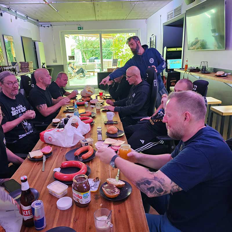 Zum Abendessen gab es dann stilecht Pizza und Nudeln vom Italiener. Dazu reichlich Bier, Whisky und – ja, wie nennen wir es? „Medizin“ von Deathkitty? Was auch immer das war, es hat definitiv seine Wirkung nicht verfehlt. Die Härtesten von uns saßen bis 5 Uhr morgens noch am PC und zockten, als wäre die Nacht unendlich. Der Rest von uns hat sich auf den Samstagmorgen gefreut, denn da ging es zur Bäckerei, die wir mal so richtig an ihre Grenzen gebracht haben. Brötchen und Baguettes für alle! Samson, unser Organisator des guten Geschmacks, hat für den perfekten Aufschnitt gesorgt. Frisch gestärkt ging es dann direkt wieder ab in die nächsten Runden CS2.